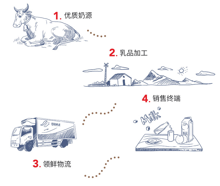 2000多个经销商和60万个有效销售网点,覆盖全国的销售网络<br> 随心订新鲜直达,每天为20多个城市的200万个家庭直送新鲜营养,实现牧场与餐桌的无缝连接。