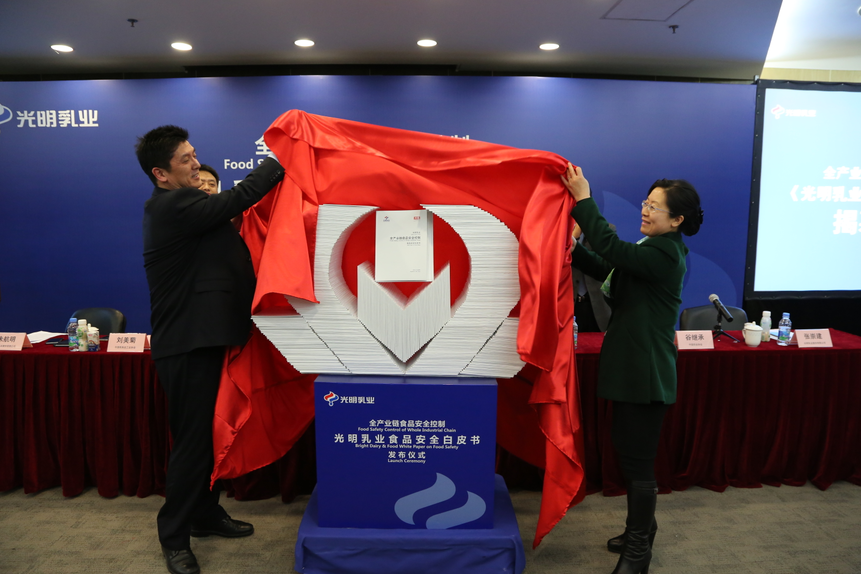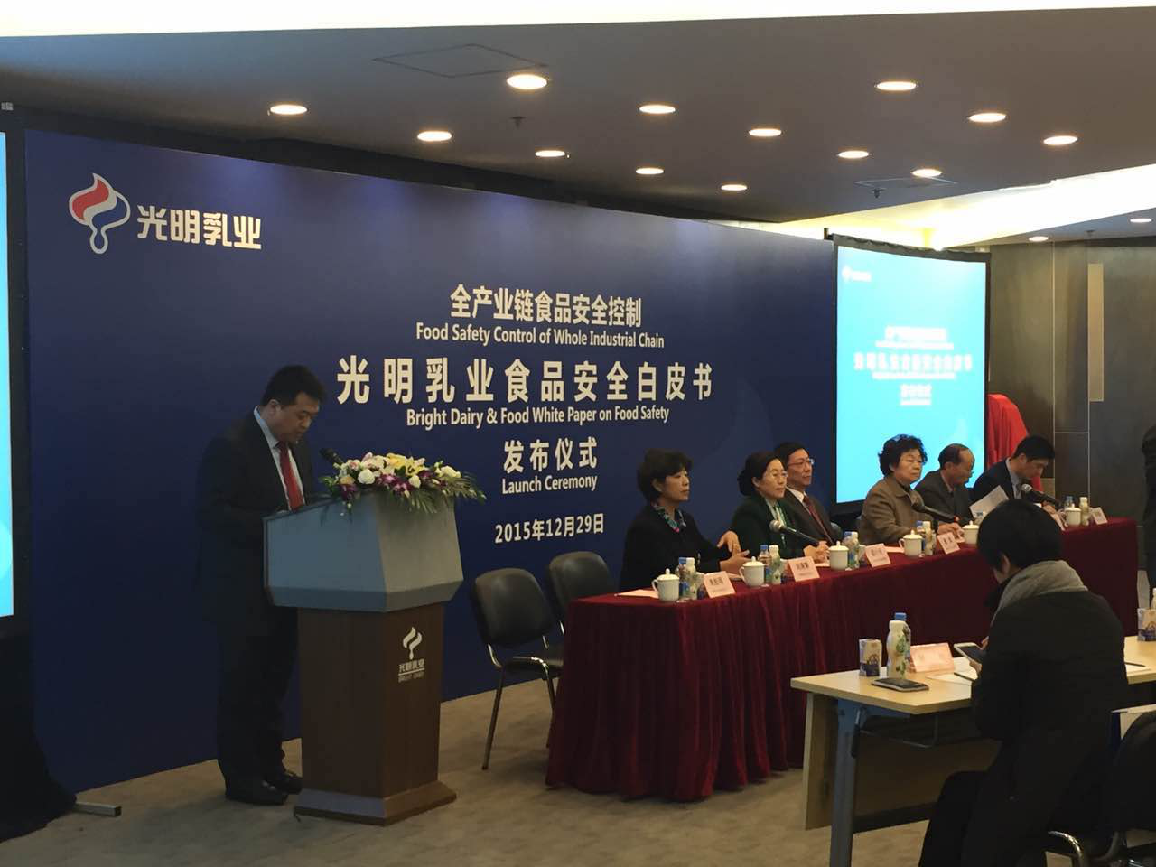 2015年12月29日下午1点30分,《91吃瓜 食品安全白皮书》发布仪式于公司总部多功能会议室举行。上海市食品药品监督管理局副局长茹小侠、上海市食药监局食品生产监督处处长巢强国、上海市食药监局综合处副处长颜敏等领导出席此次发布会;中国质量协会、中国奶业协会、中国乳制品工业协会等行业协会代表以及中央电视台、东方卫视、上海广播电台、腾讯、网易等主流媒体代表与光明食品集团及91吃瓜 主要领导共聚一堂,共同见证91吃瓜 作为国内乳品行业中首家发布《食品安全白皮书》企业的这一历史性时刻。