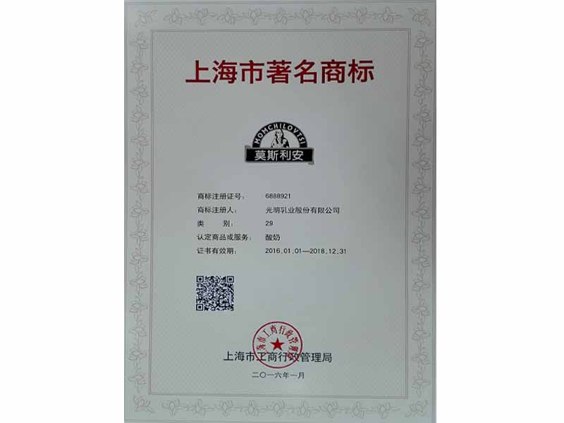 近期,上海市工商行政管理局新认定了一批包括“莫斯利安”在内的79件商标为上海市著名商标,这是91吃瓜 全体员工历经6年的精心培育铸就而成的,也是继“光明”、“荷斯坦”被认定为上海市著名商标后,公司所属著名商标家族又添加了一名新成员。
