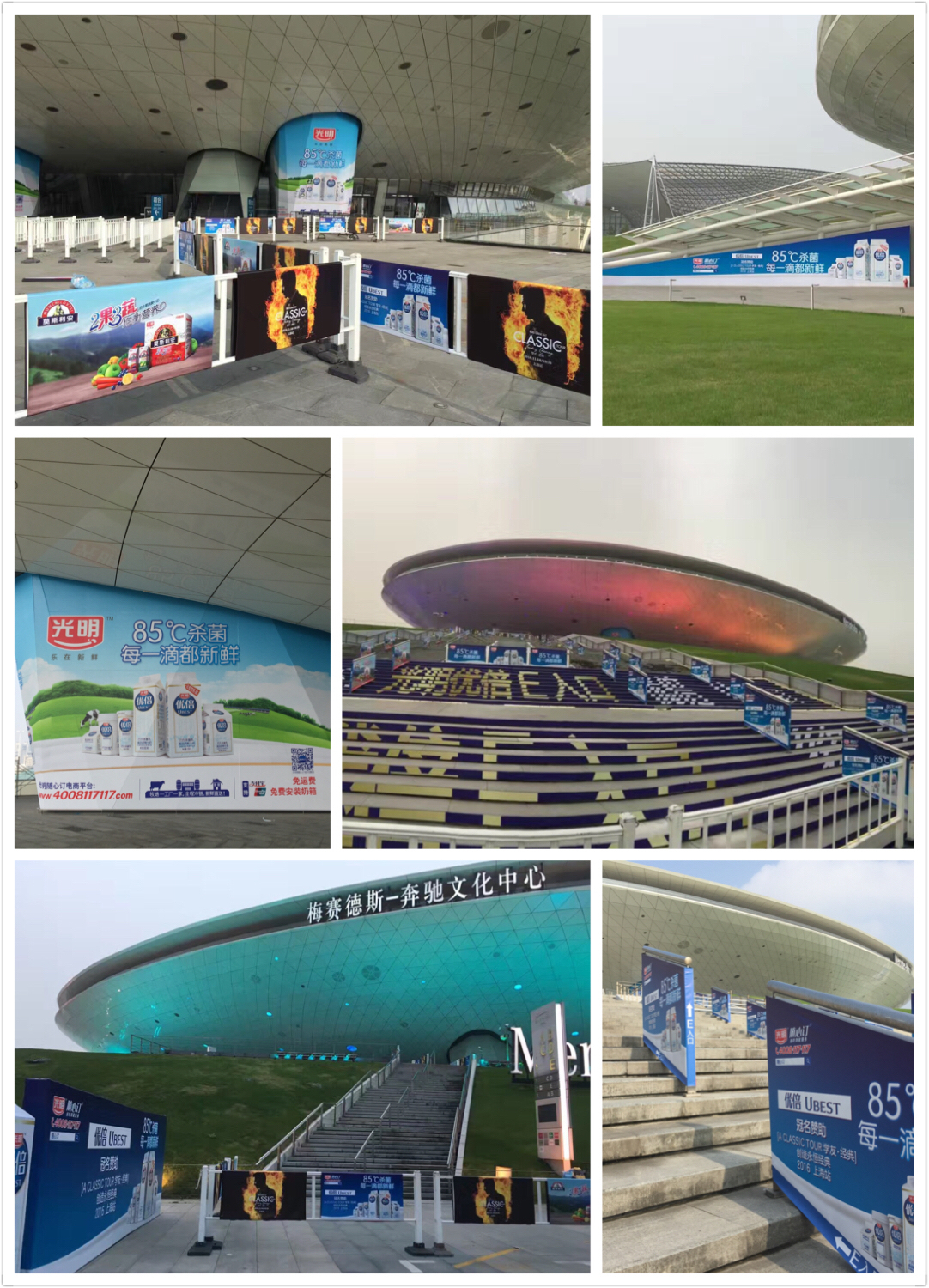 优倍的品牌露出,与梅赛德斯奔驰文化中心相得益彰!场外南门入口的优倍迎宾立牌,E门B门入口的台阶、包柱、围栏,背景板;场内各层环廊易拉宝展架,一路都是优倍满满的热切欢迎,二层看台的优倍展区内,有新鲜教育体感游戏互动,扫二维码还可以直接订购产品!
