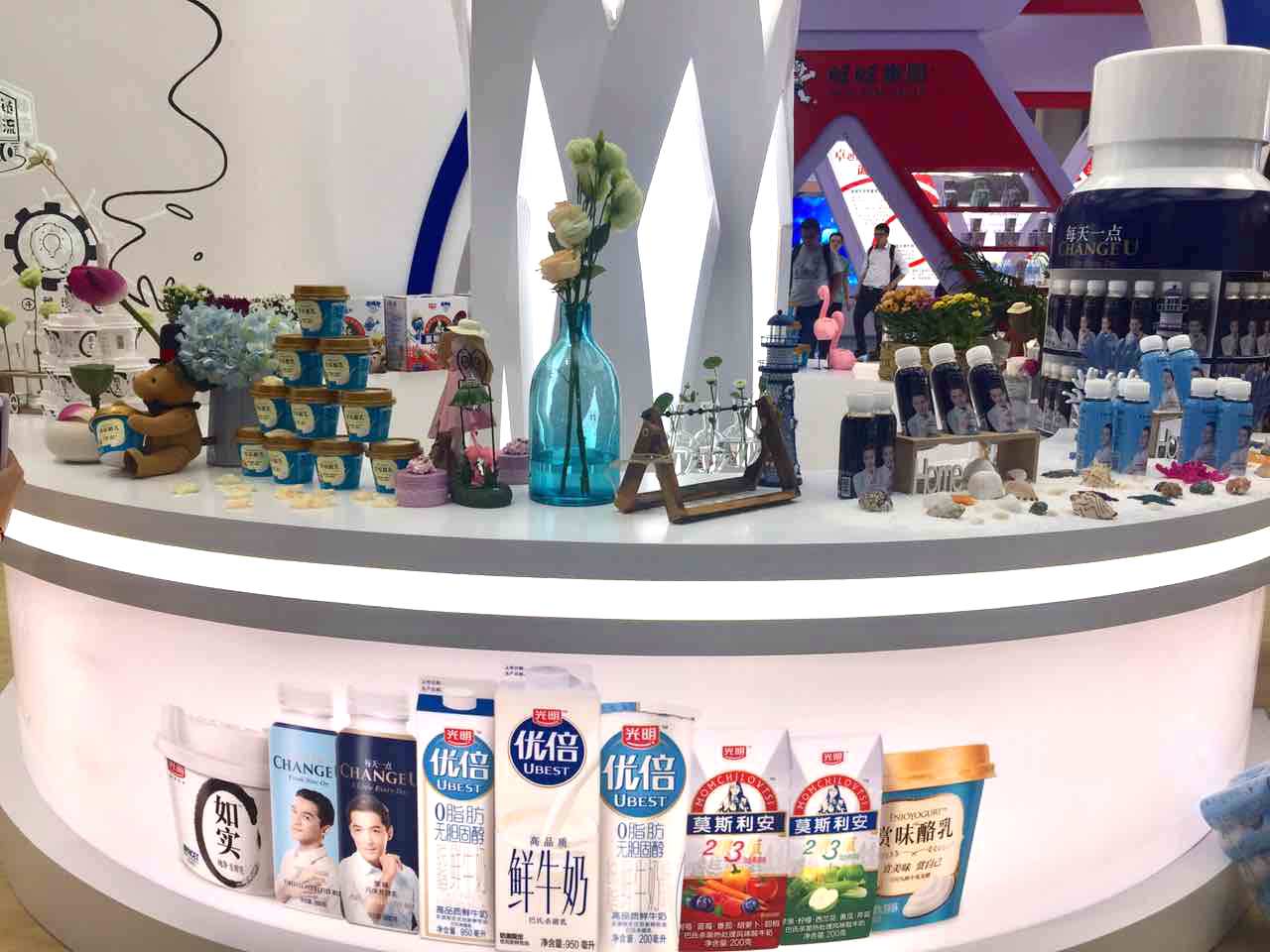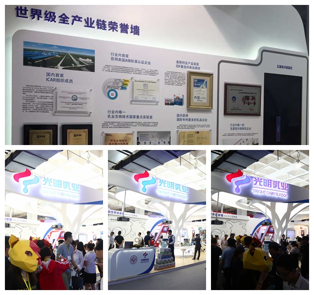展位宽敞亮堂,全产业链荣誉墙、白皮书二维码翻页体验、多点互动墙等展示内容别致新颖、吸引眼球,以世博轴为原型的光明树下精心布置的产品和配饰充分展现了海派情调。