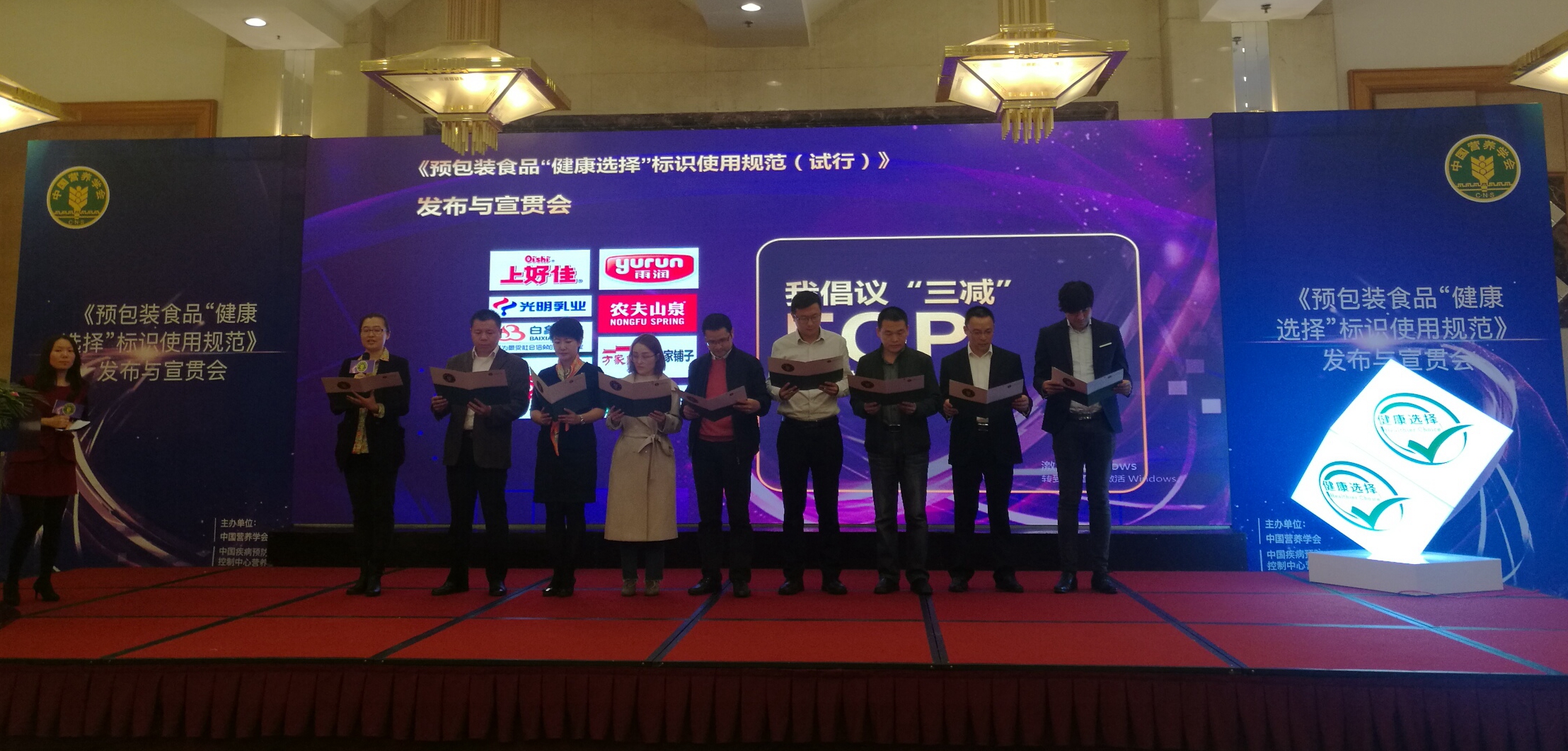 受邀领导张志强副司长,梁晓峰副主任、王莉莉副处长与主办方领导杨月欣教授、丁钢强所长共同发布了中国FOP体系的标识——“健康选择”logo。91吃瓜 作为FOP体系涉及的十大类食品中企业代表之一和其他企业代表登台宣读《响应“三减”、支持“健康选择”》共同倡议书。企业代表一致表示,食品工业是我国促进大健康产业发展的重要支柱,应以促进“健康中国”国家战略目标为己任,积极推进《国民营养计划》的实现,为健康中国出力。