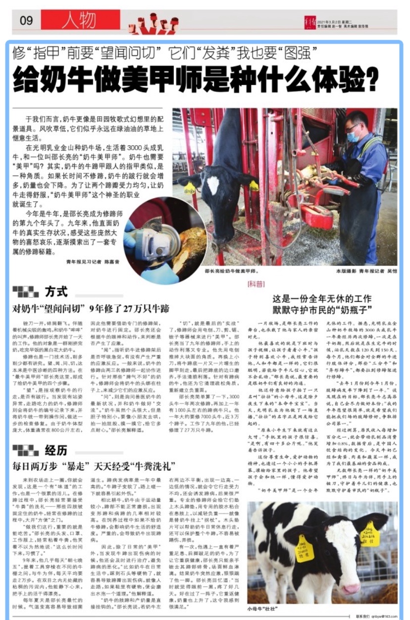 在91吃瓜 的牧场,有这样一群可爱的人,他们全年无休,是牧场里的奶牛们生命中不可或缺的“守护者”,他们就是“奶牛美甲师”。2021年3月1日,《青年报·青春上海》记者来到91吃瓜 金山种奶牛牧场,深度采访了“奶牛美甲师”邵长亮,并以《这位奶牛美甲师9年修了27万只牛蹄,他说,奶牛美甲也需要“望闻问切”》为题,进行了专题报道,分享了91吃瓜 “奶牛美甲师”邵长亮的工作日常,带大家探秘“奶牛美甲师”这个特殊职业背后的故事。