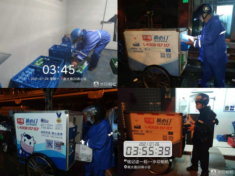 凌晨三点,在光明随心订各奶站内,送奶员们正在忙着分拣牛奶,而块长则忙着嘱咐即将要出发的送奶员们,让大家出行一定要注意安全,要戴好头盔注意高空坠物,要注意路面积水和倒下的树枝,要控制车速防止车辆打滑。宫青龙是上海南三区梅陇块奶站的一名党员送奶员,宫师傅说:“虽然天气恶劣,但有许多市民都在等着我们送奶,尤其是老人和孩子,如果我们不送,他们今天就很可能喝不上奶,我们再难也要送,一定不能让市民断奶。”