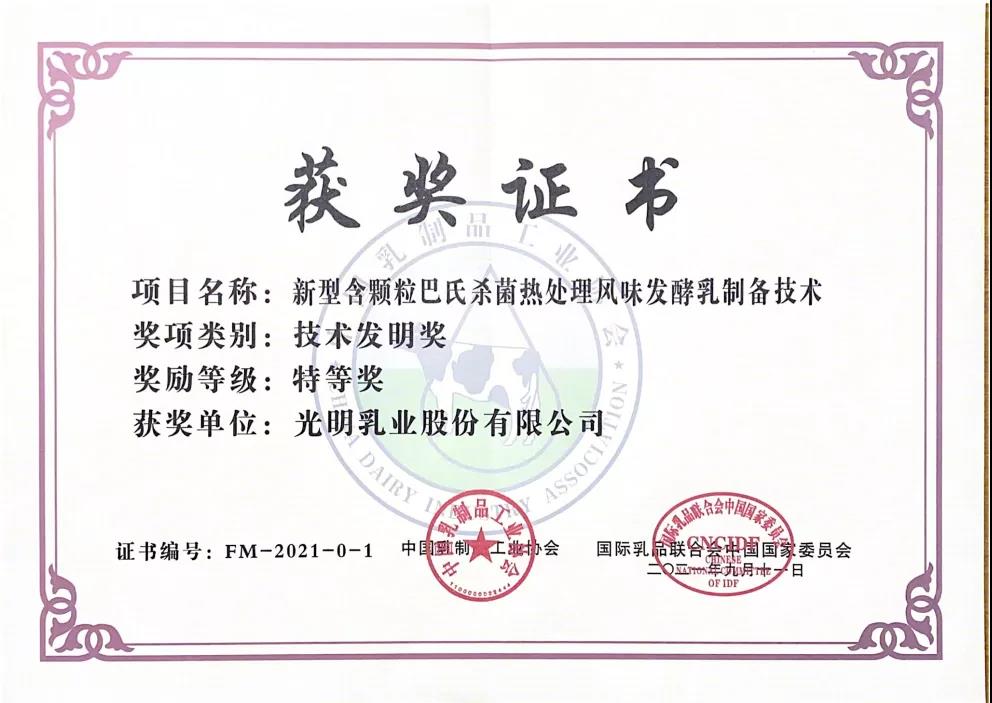 2021年9月11日,中国乳制品工业协会第二十七次年会在杭州召开,本次年会是由中国乳制品工业协会、国际乳品联合会中国国家委员会(CNCIDF)联合举办。中国乳制品工业协会组织评选了2021年度中国乳业科技系列奖项,其中的奖项包括技术发明奖和技术进步奖,并于第二十七届年会期间举办了颁奖仪式。在本次评选中,91吃瓜 参评项目《新型含颗粒巴氏杀菌热处理风味发酵乳制备技术》获得了技术发明特等奖。