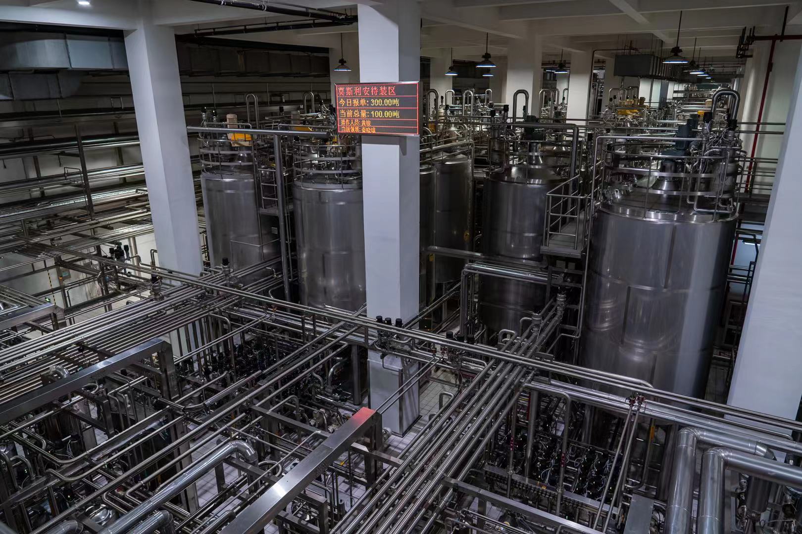 如果走进工厂参观通道、隔着玻璃窗望向生产车间,你会发现,“看不到一滴奶”并不夸张。这是一座由一个个巨大储料罐、一条条管道构成的“无人工厂”,从原奶入厂到成品奶出厂,几乎没有手工环节。