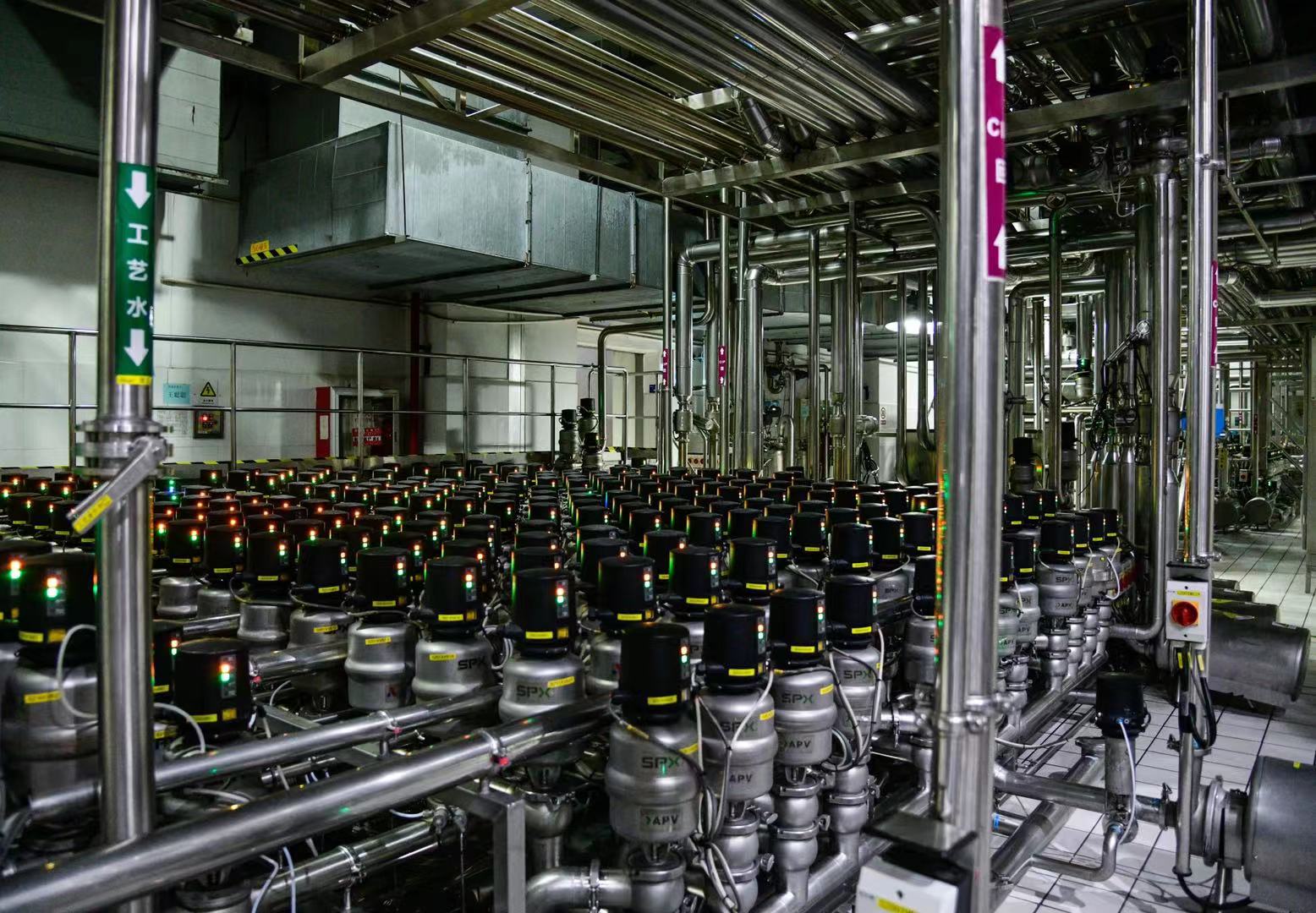 记者了解到,这是数字化解决方案的成果,整个生产车间里一共有1.8万个自动控制阀,它们构成了目前国内乳业单体车间最大的“阀阵”。在数字化系统操控下,控制阀根据不同生产环节,自动调整方向,将原料送往指定的管道和储料罐。