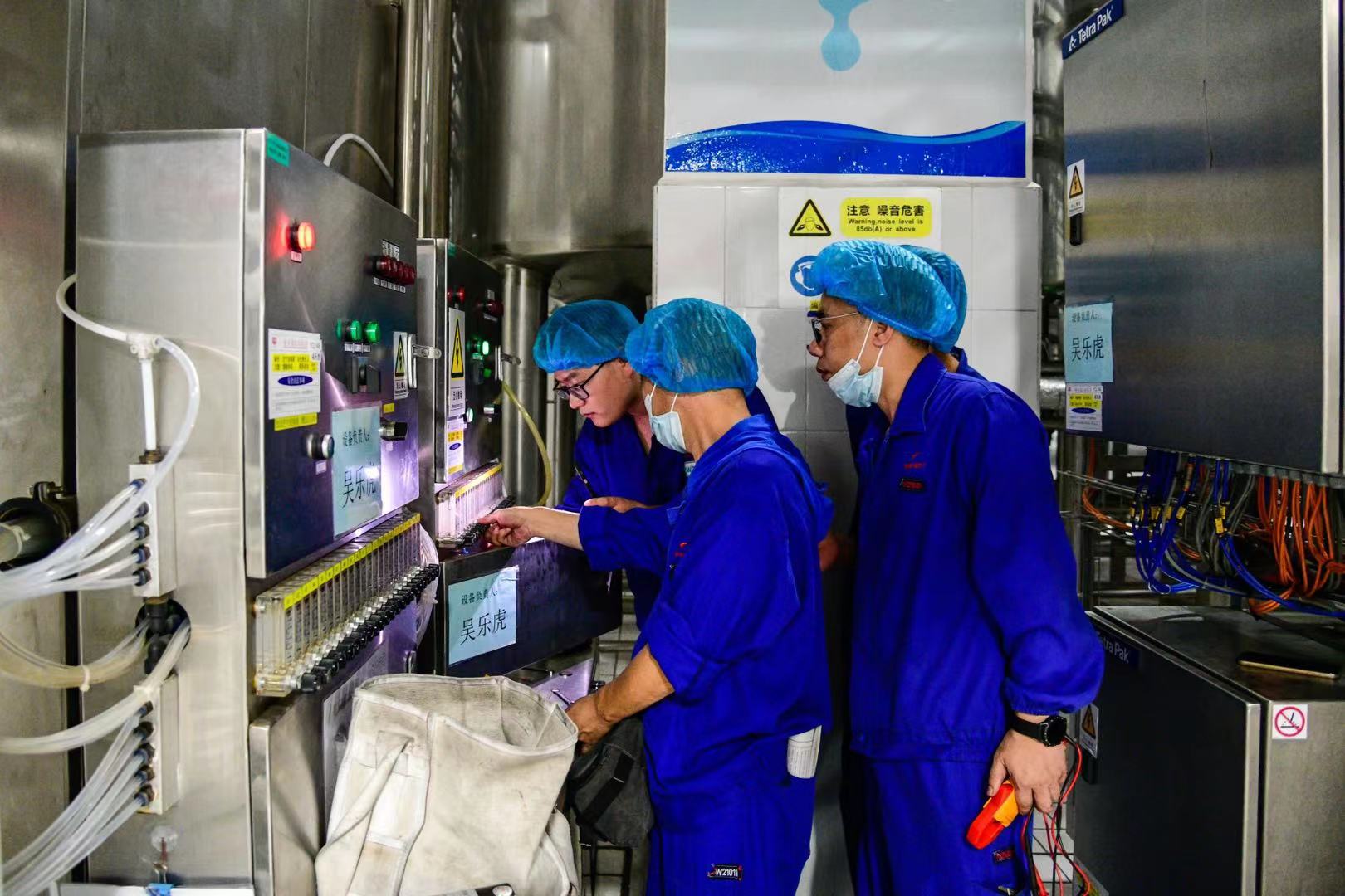 在接下来的生产环节,“阀门阵”同样承担着分流、引导的作用。机器轰隆隆转动,生奶从走上生产线开始,在管道中一路往前冲,待到“落地”已是成品。