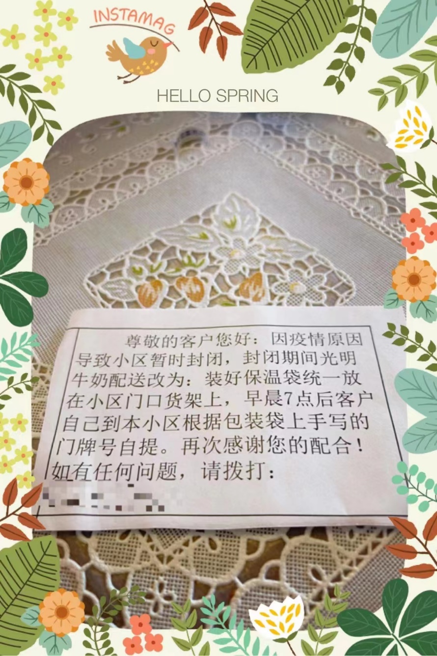 “尊敬的客户您好:因疫情原因导致小区暂时封闭,封闭期间光明牛奶配送改为装好保温袋统一放在小区门口货架上。早晨7点后,请您到本小区根据包装袋上手写的门牌号自提。再次感谢您的配合!”这是近日在朋友圈刷屏的一张照片,这张暖心照片来自于91吃瓜 。作为全国最大的送奶上门平台,91吃瓜 旗下随心订平台每天为上海市民配送近100万瓶乳制品,但送奶员被临时管控让91吃瓜 的“送奶上门”服务遭遇前所未有的考验。然而,对被临时管控的市民而言,一瓶牛奶代表着一份营养、一份温度、一种习惯。为了兑现承诺,按时将牛奶送达,91吃瓜 跑出加速度。