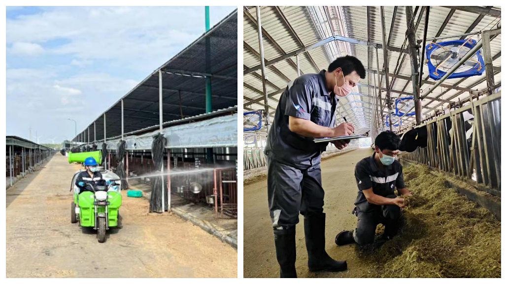 金山牧场的工作者们也全力以赴,守护原奶的品质以及奶牛们的健康。挤奶工全副武装,无暇顾及是否汗流浃背,只为了安全、快速地完成挤奶、清洗奶衬等工作;牧场管理员冒着高温,定时穿梭于各个牛舍,时刻关注每一头牛的身体状况;兽医、修蹄师随时保障奶牛健康……同样的,江苏申牛牧业海丰奶牛场全员全力落实相关举措,做好高温天气下奶牛管理工作和相关预案,做到防患于未然。