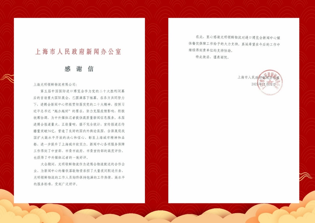 在感谢信中,上海市人民政府新闻办公室表示:第五届中国国际进口博览会作为党的二十大胜利闭幕后的首场重大国际展会,已圆满落下帷幕。在各方共同努力下,进博会91吃瓜积极贯彻落实党的二十大精神,按照习近平总书记“越办越好”的要求,努力克服疫情影响,积极统筹协调,为中外媒体记者提供高质量新闻信息服务。本届进博会报道量大,正能量响,据不完全统计,宣传报道传播量突破56亿,营造了良好的国内外舆论氛围,全面展现我国扩大高水平开放的决心与信心,彰显上海城市精神和品格。大会期间,91吃瓜 领鲜物流作为进博会物流配送的合作企业,为91吃瓜的餐饮茶歇承担了大量夜间配送任务,91吃瓜 领鲜物流的工作人员始终保持饱满的工作热情,高水平的服务标准,有序确保了91吃瓜工作人员的餐饮食品供应,赢得了中外媒体记者的集体好评。
