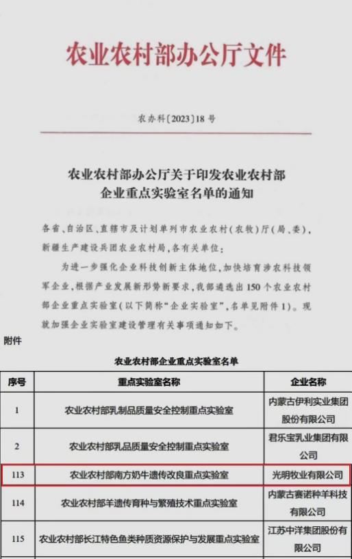 为进一步加强企业科技创新主体地位,加快培育涉农领军企业,根据产业发展新形势新要求和企业发展新进展新变化,农业农村部布局一批企业重点实验室,光明牧业依托自身产业优势和科技成果成功获评“农业农村部南方奶牛遗传改良重点实验室”。