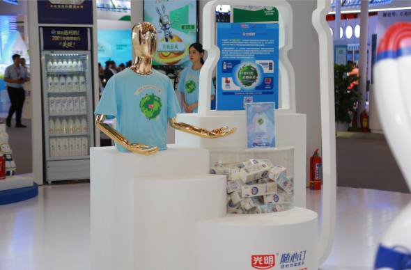 同时,全国首创的“牛奶纸盒回收行动”全面升级为“牛奶包装回收行动”后,也在奶业展现场重磅亮相。除原有纸盒外,把可回收塑料瓶也纳入了包装回收范围。兑换礼品中的再生纤维环保T恤上身现场工作人员与核心展陈区域。