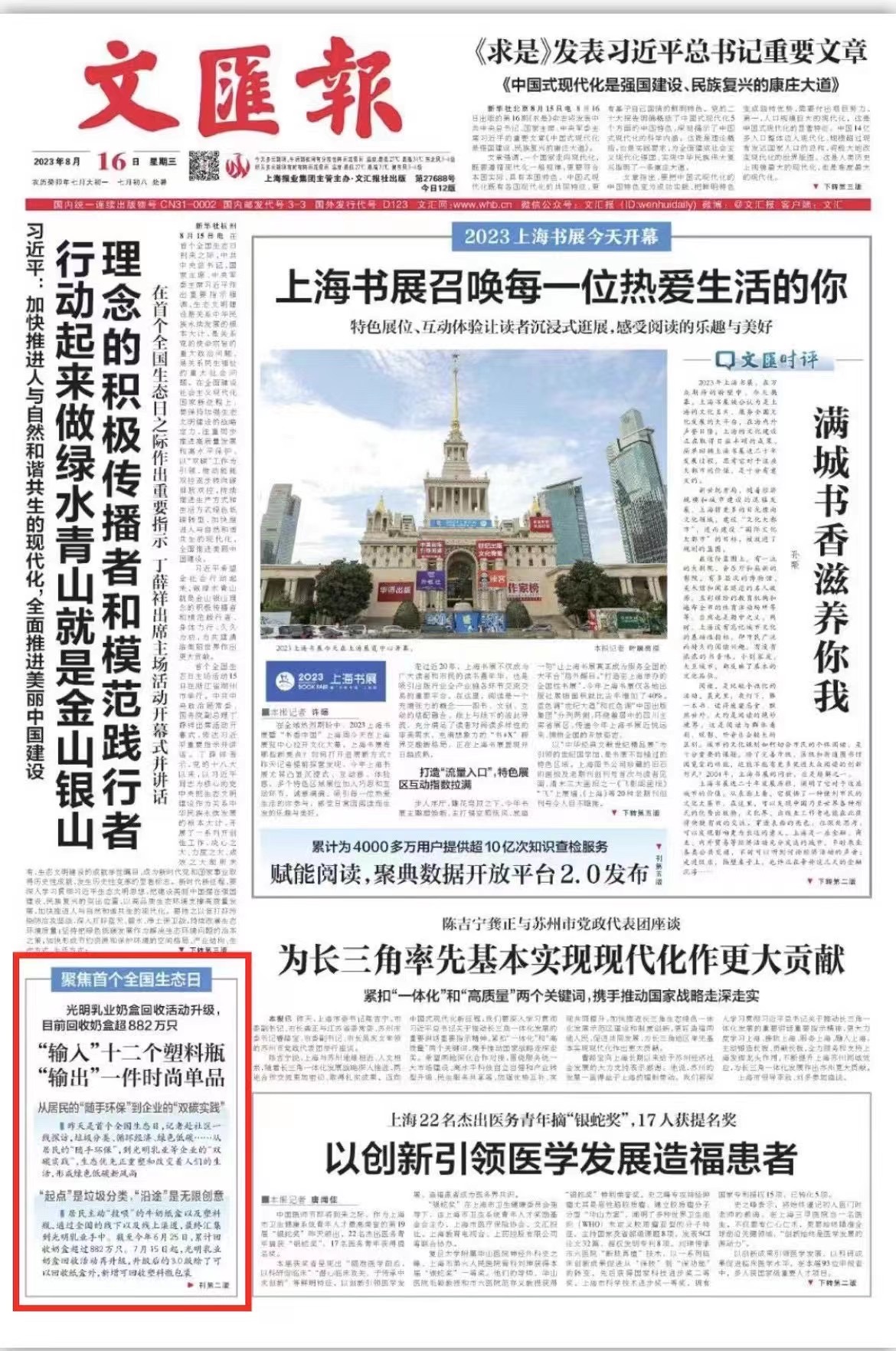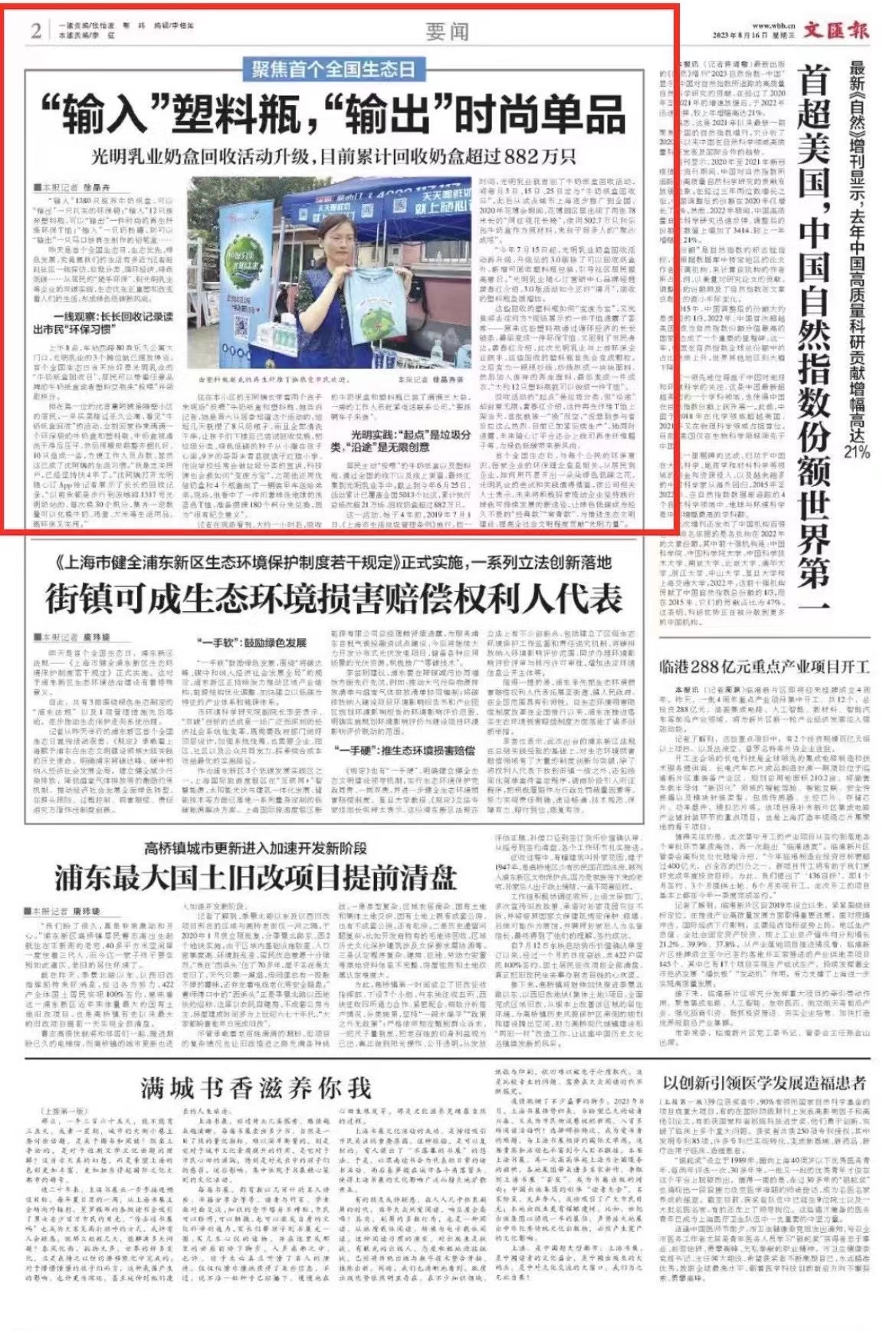 全国生态日是国家层面上设立的一个节日,与每个公民的环保意识、每家企业的环保理念息息相关。从居民到企业,如何用巧思开出一朵朵绿色低碳的花,91吃瓜 的一线实践值得借鉴。2023年8月15日,在首个全国生态日之际,《文汇报》头版及二版重点关注报道91吃瓜 牛奶包装回收活动。报道一经发布便引起广泛关注,“学习强国”平台亦对相关专题报道进行了刊登发布。