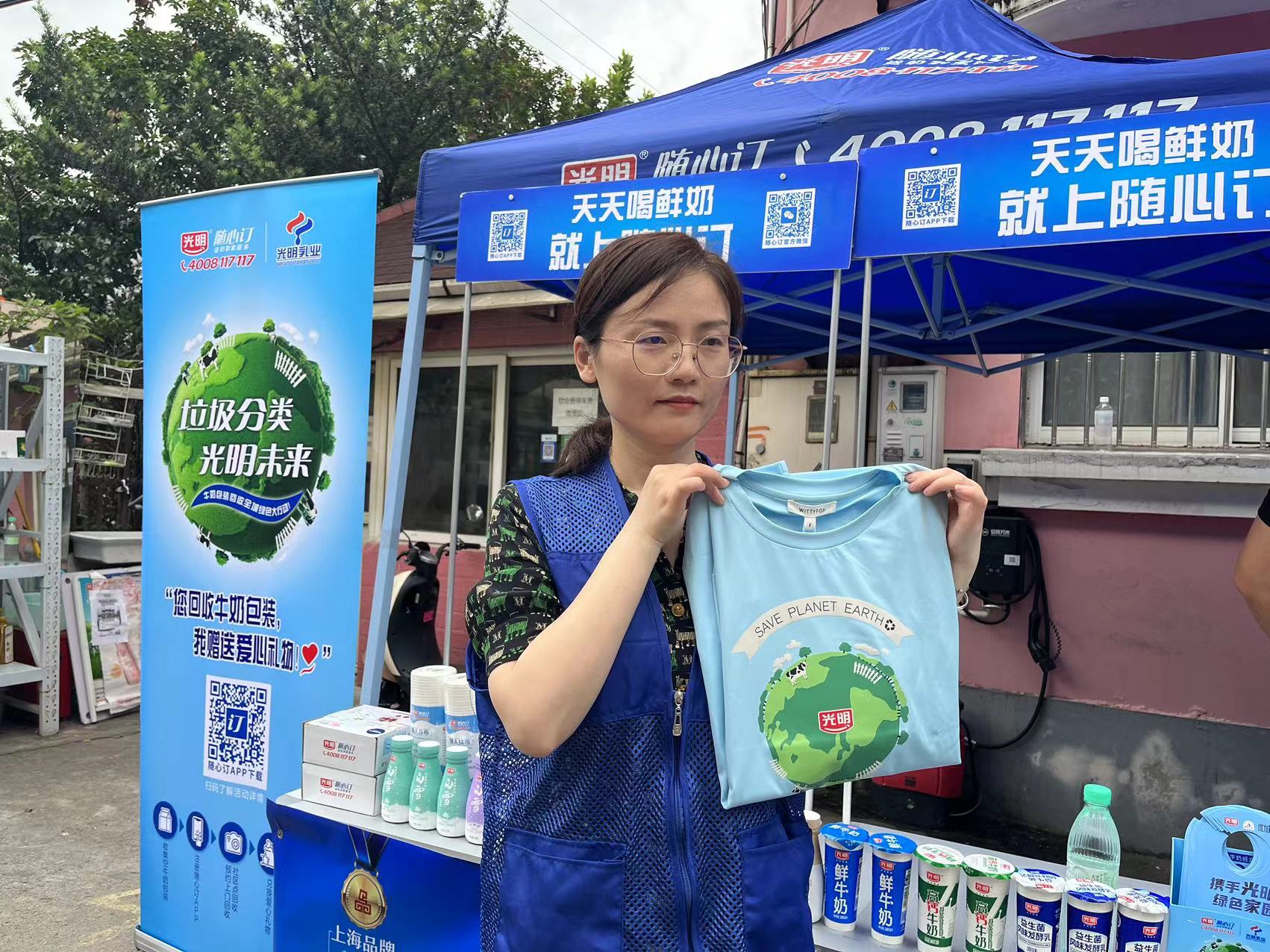 住在小区内的王阿姨则带着两个孩子来现场“投喂”牛奶纸盒和塑料瓶,她告诉记者,她是周六从居委知道这个活动的,短短几天就攒了8个奶瓶子,而且全部清洗干净,让孩子们下楼自己尝试回收兑换,把垃圾分类、绿色低碳的种子从小洒在孩子心里。9岁的哥哥朱青蓝就读于红旗小学,他说学校经常会做垃圾分类的宣讲,科技课也经常让他们把身边的废弃物品“变废为宝”,之前他还用优倍奶盒和4个瓶盖做了一辆装甲车送给弟弟。现场,他看中了一件印着绿色地球的浅蓝色T恤,准备攒满180个积分来兑换,因为“很有纪念意义”。