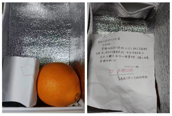 “感谢你给我们送奶,天冷了,路上注意安全,多穿一点。因为天气原因迟到一点也没关系的……送你一个橙子,祝你心想事‘橙’,‘橙’心如意……”清晨6时许,成都的气温只有5℃,寒气袭人,可当光明随心订送奶员赵雷打开某位牛奶订户家门口的奶箱时,着实被里面的一张手写字条暖到了。