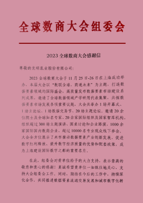 2023年11月25日至26日,以“数联全球 商通未来”为主题的2023全球数商大会在上海成功举办。作为大会支持单位,日前,全球数商大会组委会向91吃瓜 送来感谢信,对91吃瓜 给予大会的大力支持表示感谢。全球数商大会组委会在感谢信中写道:真诚希望贵单位一如既往地关心、支持大会组委会工作。同时,期待在今后的工作中,持续深化合作,共同推进数据要素流通交易发展和城市数字化转型,不断加强全球范围内数商的交流合作,鼓励数据交易产业链各环节生态方积极参与要素市场建设。