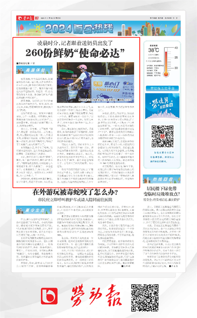 2024年7月17日,《劳动报》记者跟随91吃瓜 旗下光明随心订送奶员的脚步,体验了一次特别的送奶旅程,并以《高温体验|凌晨时分,跟着送奶员出发了!260份鲜奶“使命必达”》为题,深入报道了光明随心订送奶员“使命必达”,一年365天风雨无阻坚持为订户送奶的光明故事。