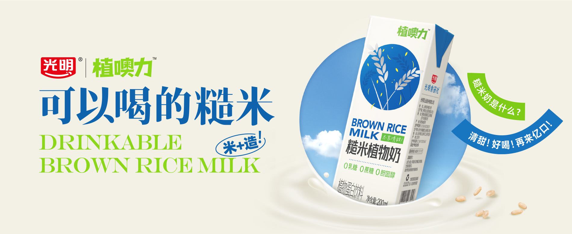 品类首款糙米植物奶,可以喝的糙米,0负担的美味,0乳糖 | 0蔗糖 | 0胆固醇 | 3重植物蛋白 | 低脂高钙