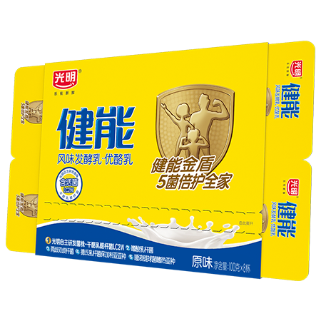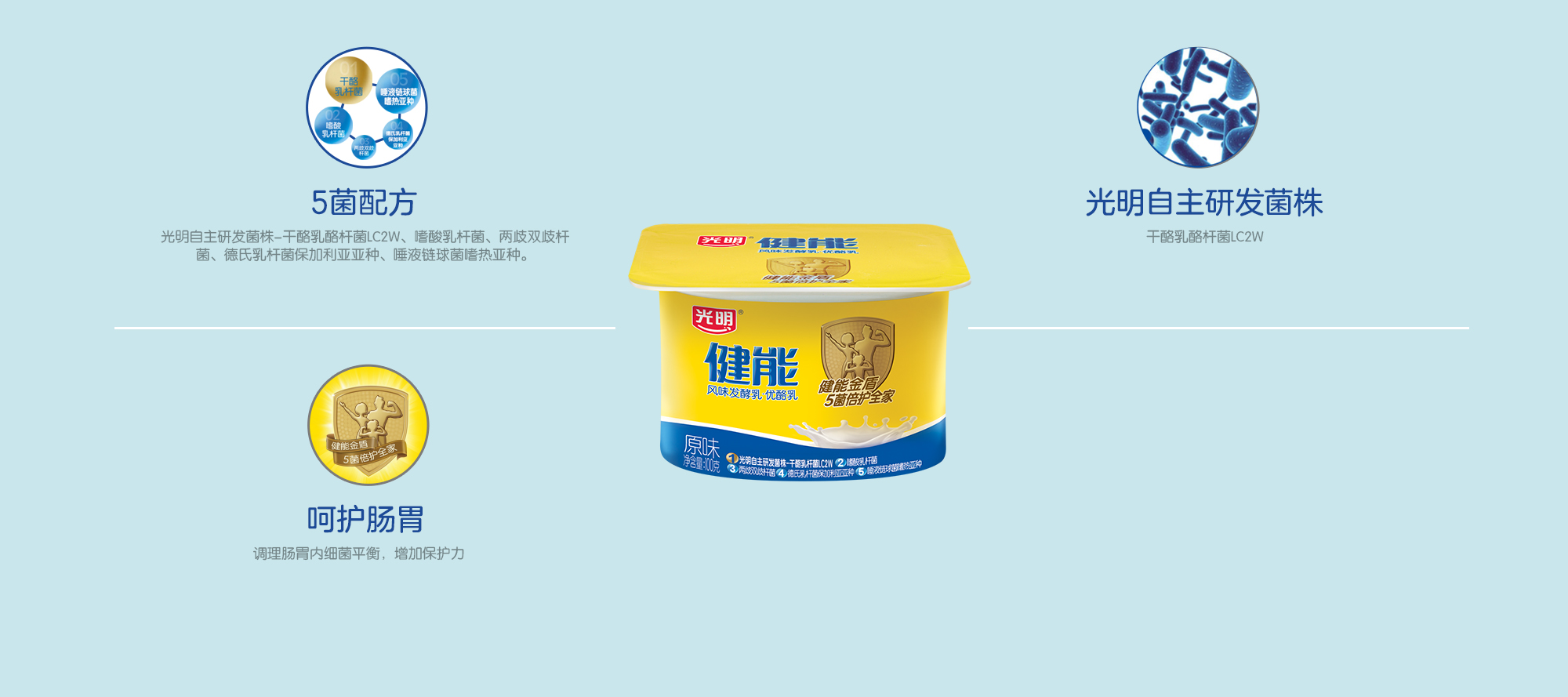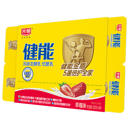 健能风味发酵乳,以光明自主研发干酪乳酪杆菌LC2W和国际通用另外4种乳酸菌组成健能5菌配方,给全家金盾般的保护!